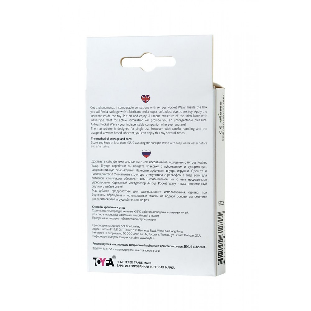 Доставьте себе феноменальные, ни с чем несравнимые, ощущения с A-Toys Pocket Wavy. Уникальная структура стимулятора с рельефом в виде волн для активной стимуляции обеспечит вам незабываемое, ни с чем несравнимое удовольствие. Карманный мастурбатор A-Toys Pocket Wavy - ваш непременный спутник в любом месте!Мастурбатор предусмотрен для единоразового использования, однако, при бережном обращении и использовании смазки на водной основе, вы сможете насладиться этой игрушкой несколько раз.