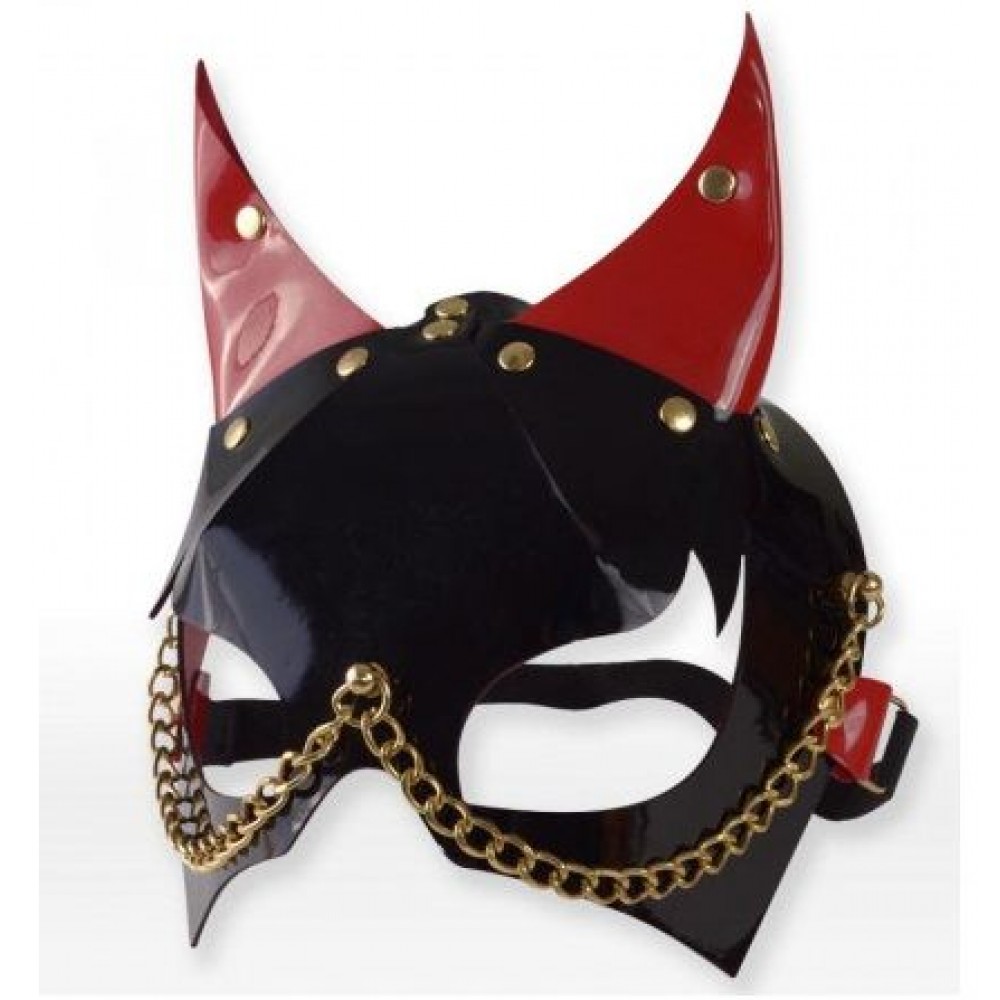Маска дьяволенка из черной и красной натуральной лаковой кожи с миндалевидными прорезями для глаз, украшенная металлическими заклёпками и цепочкой золотистого цвета. Для максимального комфорта маска имеет бархатистую велюровую подкладку, обеспечивающую приятные тактильные ощущения при соприкосновении с кожей лица. Фиксирующая резинка с пряжкой позволяет легко регулировать размер изделия.