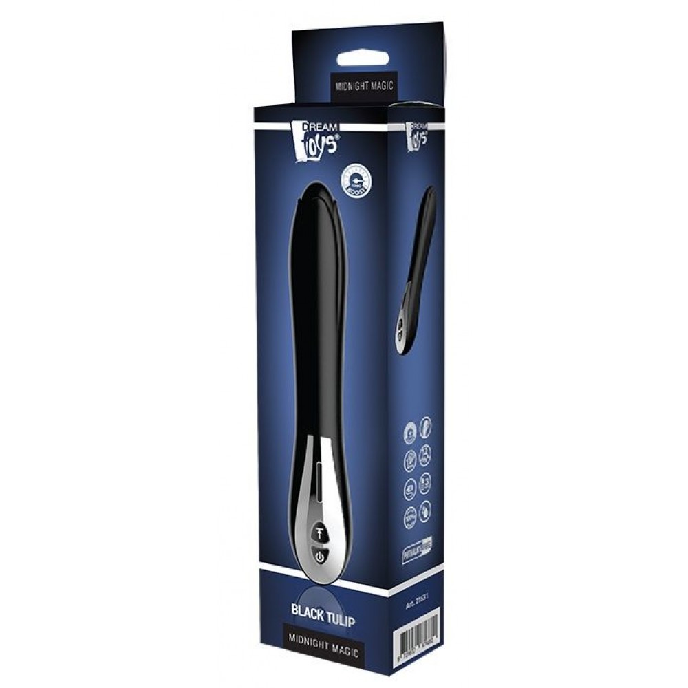 Это гладкий вибратор с гибким стержнем и верхушкой, которая выглядит как тюльпан в бутоне. Он изготовлен из безопасного для тела силикона и перезаряжается при помощи USB. Имеет 3 уровня вибрации и 9 различных ритмов. Вибратор Black Tulip также имеет режим эскалации, который работает как турбонадув для вибрации.