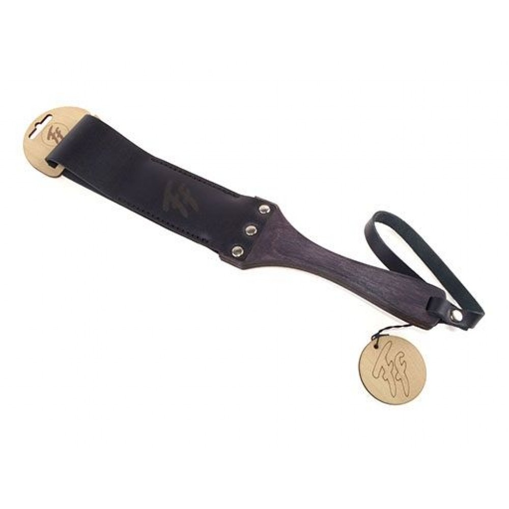 Шлепалка (паддл) - ударный девайс ручной работы для эротических ролевых игр и практик БДСМ. Эргономичная удобная рукоять изготовлена из древесного композита, имеет удобную черную кожаную петлю для фиксации изделия на запястье. Ударная часть имеет оригинальную петлеобразную форму со строчкой по краям изделия, что придает ему особую хлесткость. Шлепалка выполнена из итальянской высококачественной кожи чёрного цвета. Внутри паддла находится специальная эластичная вставка, обеспечивающая изделию красочность и гибкость. Длина ударной части - 21 см., ширина - 5,8 см.