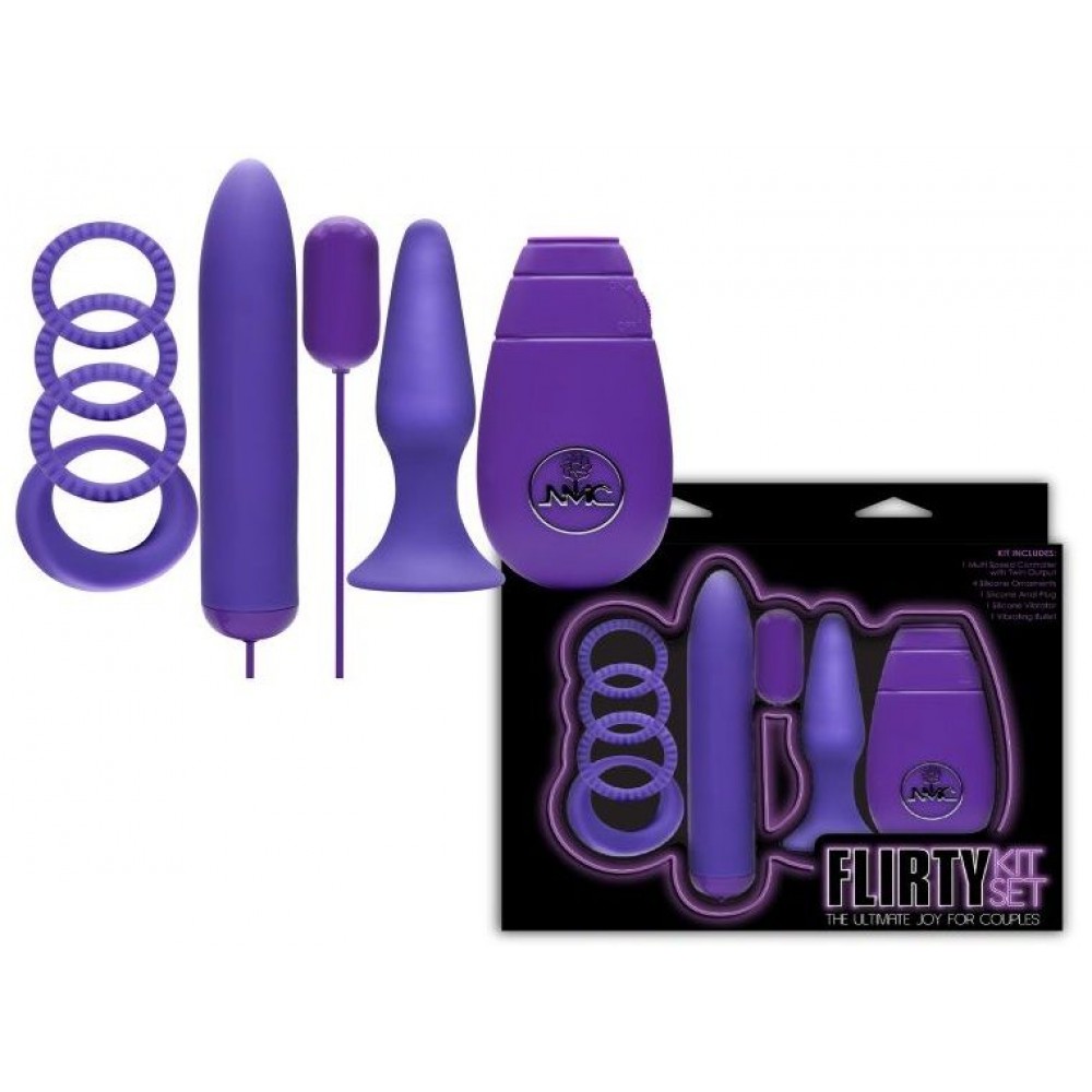 Фиолетовый вибронабор FLIRTY состоит из анальной пробки, 4 эрекционных колец, виброяичка и вибратора с пультом-контроллером. Длина вибратора - 12,7 см.
