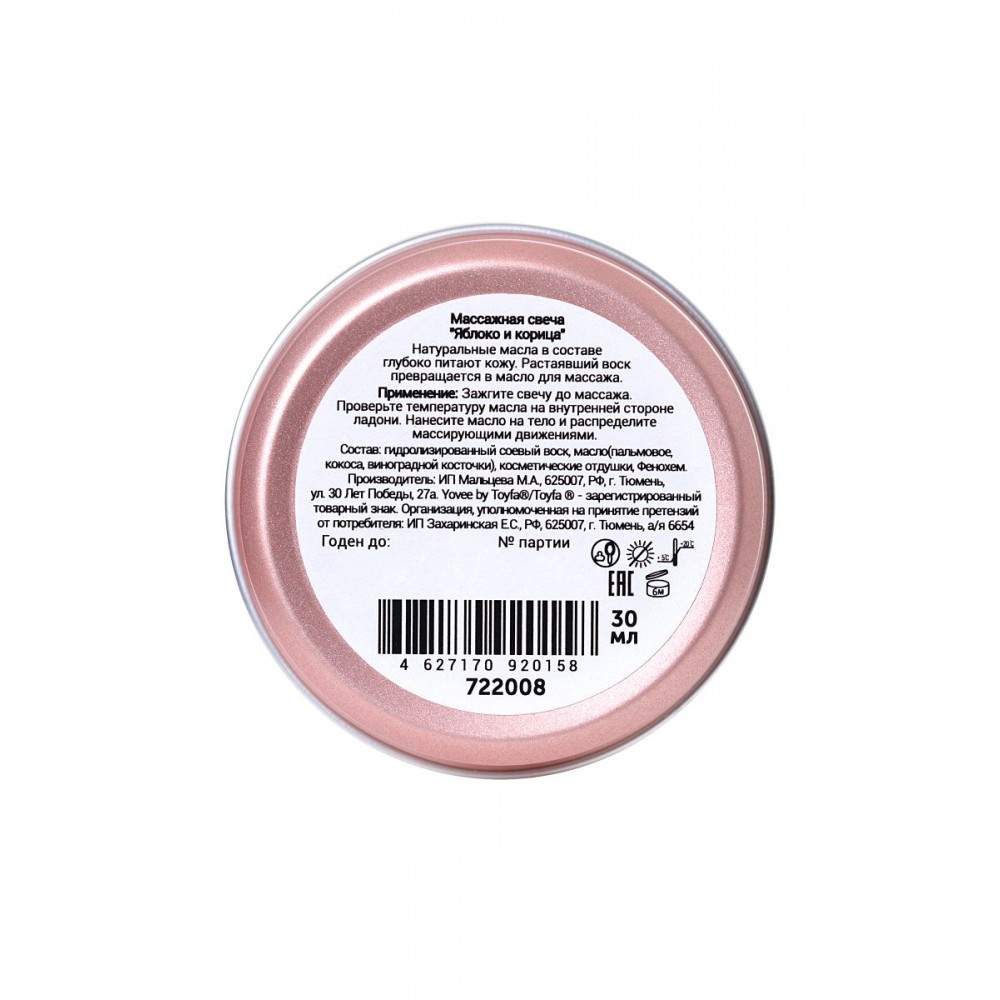 Натуральные масла в составе глубоко питают и увлажняют кожу. Растаявший воск превращается в масло для массажа. Свеча поможет подготовить вашу кожу к свиданию.Подготовьтесь к свиданию: после приятной и расслабляющей ванны зажгите свечу. Насладитесь пряными ароматами яблока с корицей, которые наполнят вашу комнату. Зажгите свечу и немного подождите, пока масло остынет. Нанесите масло на всё тело и сделайте лёгкий, расслабляющий массаж. После питательных масел ваша кожа будет мягкой и нежной.Свеча подарит незабываемые ощущения, после которых вам гарантированы нежные и мягкие прикосновения!