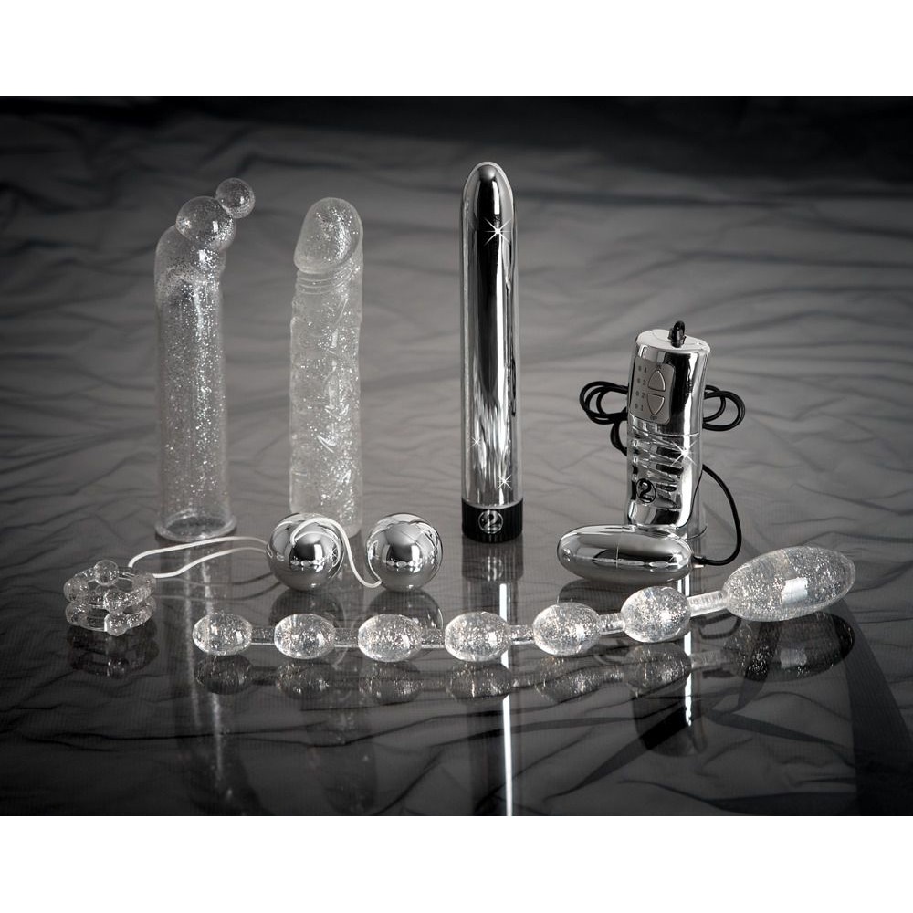 Набор эротических игрушек, состоящий из 7 предметов. Все они возбуждающе переливаются серебром и предназначены для волнующих и разнообразных любовных утех. В набор входят: 1. цепь анальных шариков из геля 2. двойное кольцо со стимулирующими шариками 3. классический вибратор 4. насадка для вибратора реалистичной формы из гелевого материала 5. насадка для вибратора с загнутой оболочкой для стимуляции точки G 6. пара шариков для удовольствия 7. виброяйцо. Длина анальной цепочки - 28 см., диаметр - 0,7-3 см. Диаметр эрекционного кольца - 2 см., (растягивается). Длина классического вибратора - 17,5 см., диаметр - 2,5 см. Длина насадки реалистичной формы - 15,5 см., диаметр - см. Длина загнутой насадки - 15 см. Диаметр вагинальных шариков - 3,5 см. Длина виброяйца - 6 см., диаметр 2,5 см.