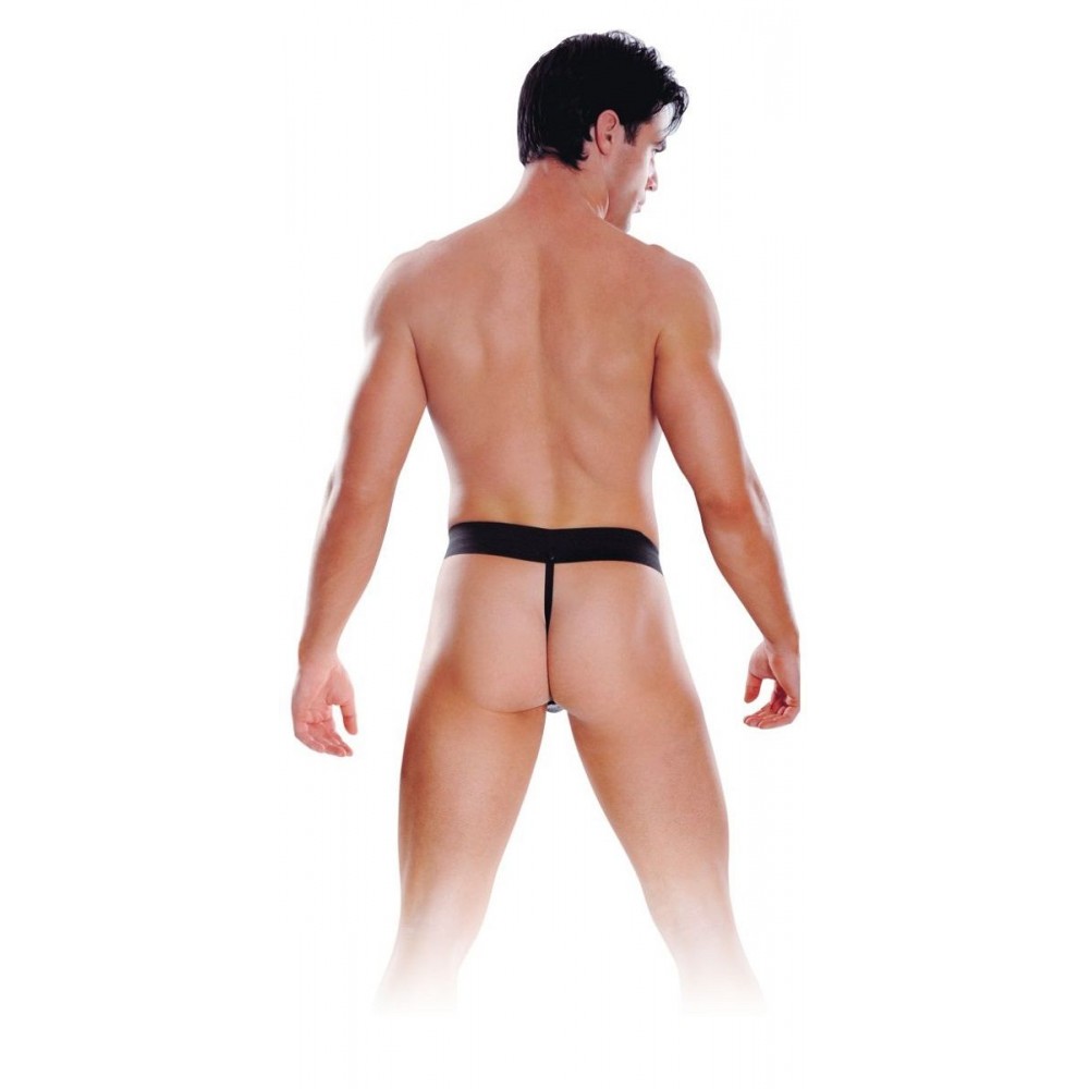 Страпон с мошонкой и ярко выраженной головкой из чёрного, эластичного силикона. Пустой внутри, с гладкой наружностью. Страпон крепится к трусикам с помощью металлического съемного кольца. В комплекте маска на глаза.