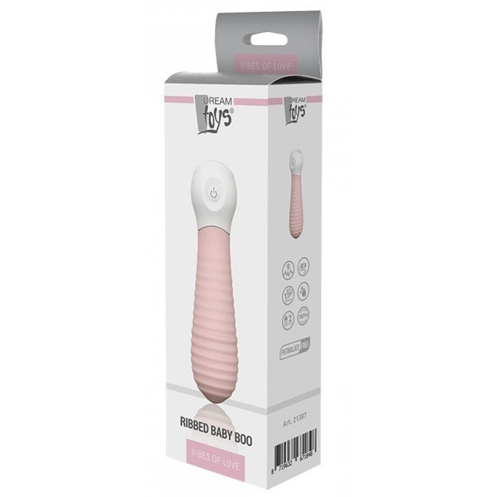 Ribbed Baby Boo - небольшой вибромассажер-фаллоимитатор с мощными вибрациями. Снабжен 9 режимами вибрации. Скромный размер ребристого вибромассажера делает его идеальным для того, чтобы взять его с собой куда угодно. Перезаряжаемый, водонепроницаемый, он сделан из безопасного силикона, не содержащего фталатов. Рабочая длина - 8 см.