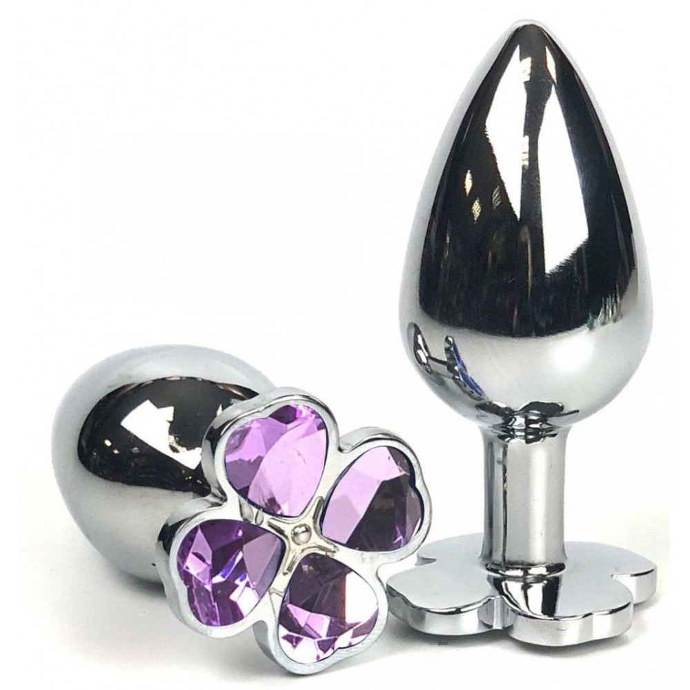 Серебристая анальная пробка Vander с сиреневым кристаллом-клевером. Рабочая длина - 7,6 см.
